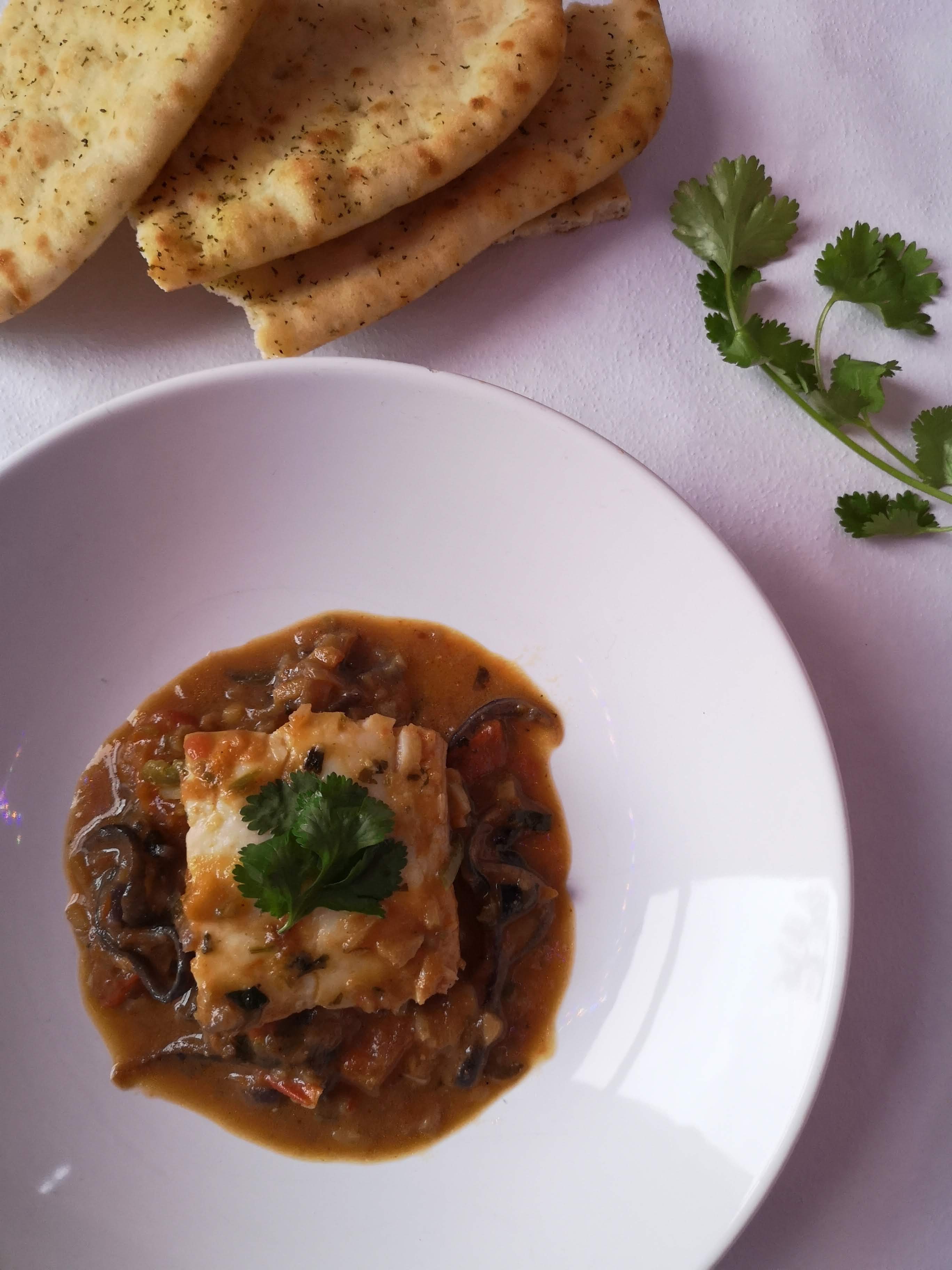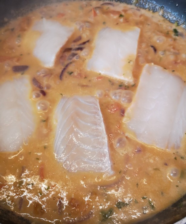 Snijd de kabeljauw in vier stukken en leg deze in de currysaus. Zet het vuur laag, doe een deksel op de pan en laat de vis in 5 tot 7 minuten gaar worden.
