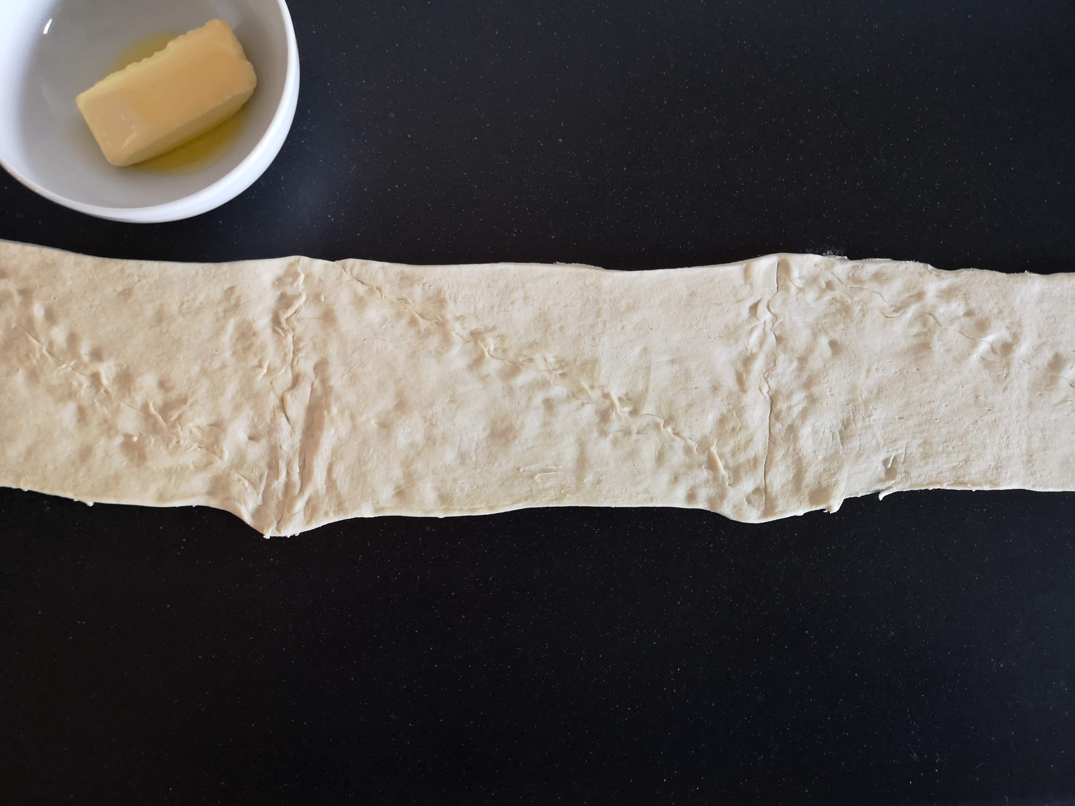 Rol het croissantdeeg uit op je aanrecht. Knijp alle randjes goed samen, zodat het één lap deeg vormt. Snijd het deeg in de lengte door midden, zodat je twee lange repen krijgt.
