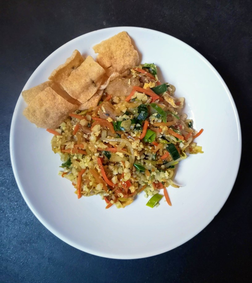 In deze vegetarische nasi heb ik de rijst vervangen door bloemkool. Groenten bevatten over het algemeen weinig calorieën maar geven je wel veel energie en de benodigde vitaminen. Door de hoeveelheid groenten heb je na het eten van deze maaltijd absoluut geen hongergevoel, want je kunt een flinke berg opscheppen. Een maaltijd die een hoog eiwitgehalte bevat en laag is in calorieën. Ideaal voor een doordeweekse dag!