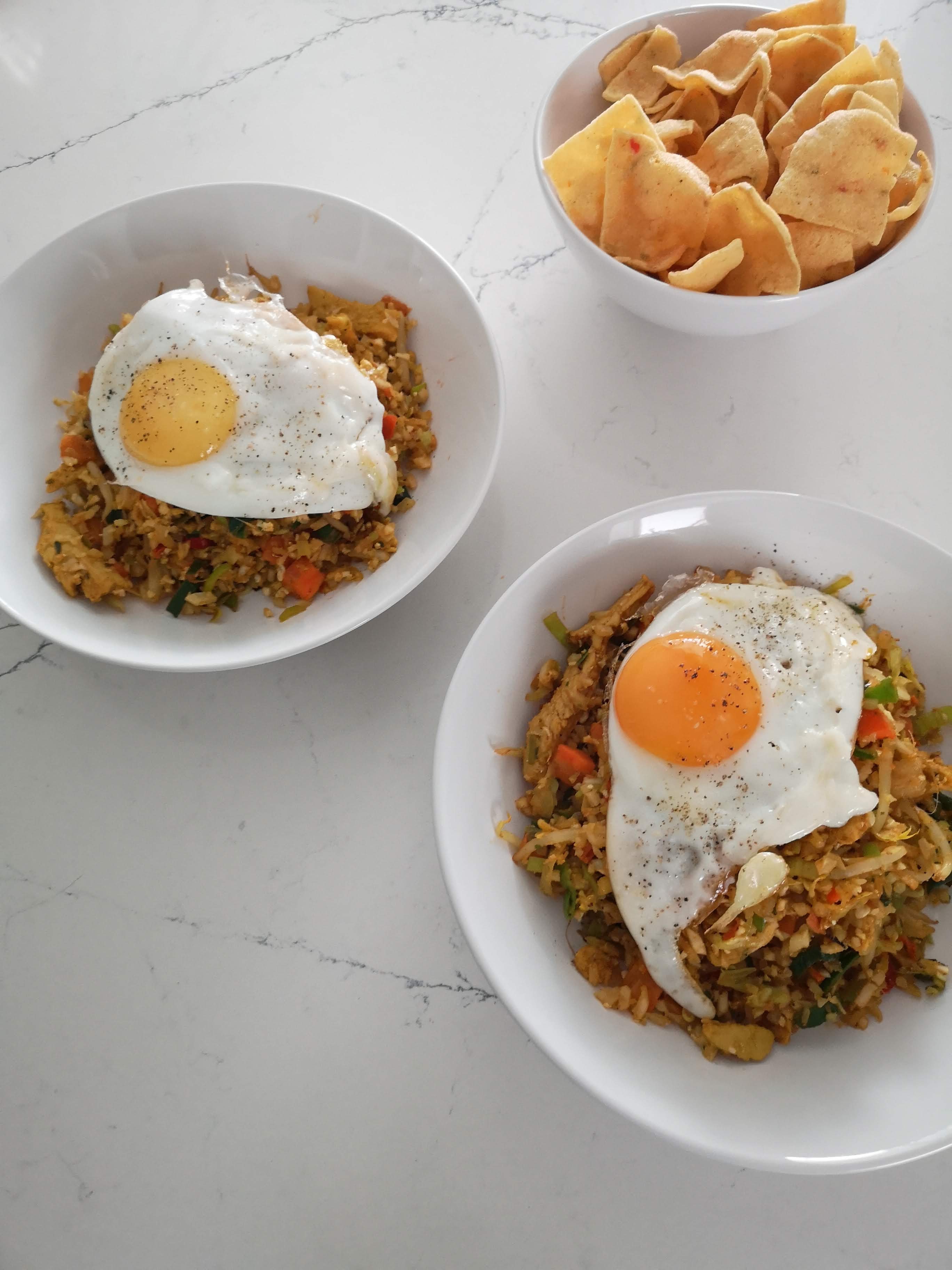 Schep de nasi op de borden en leg op ieder bord een gebakken ei. Serveer direct, ook lekker met een beetje cassave kroepoek erbij. Eet smakelijk!