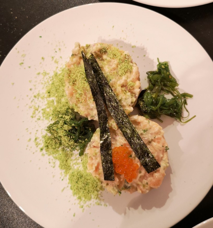 Doe op ieder bord twee rondjes zalmtartaar. Als je een kookring hebt gebruik deze dan, anders kun je een vel vershoudfolie in klein glaasje of kommetje doen, hierin de tartaar scheppen en deze omkeren op het bord. Verdeel hier reepjes van nori over, het wasabikruim en de wakame. Schep er tot slot een theelepel van de zalmeitjes op.