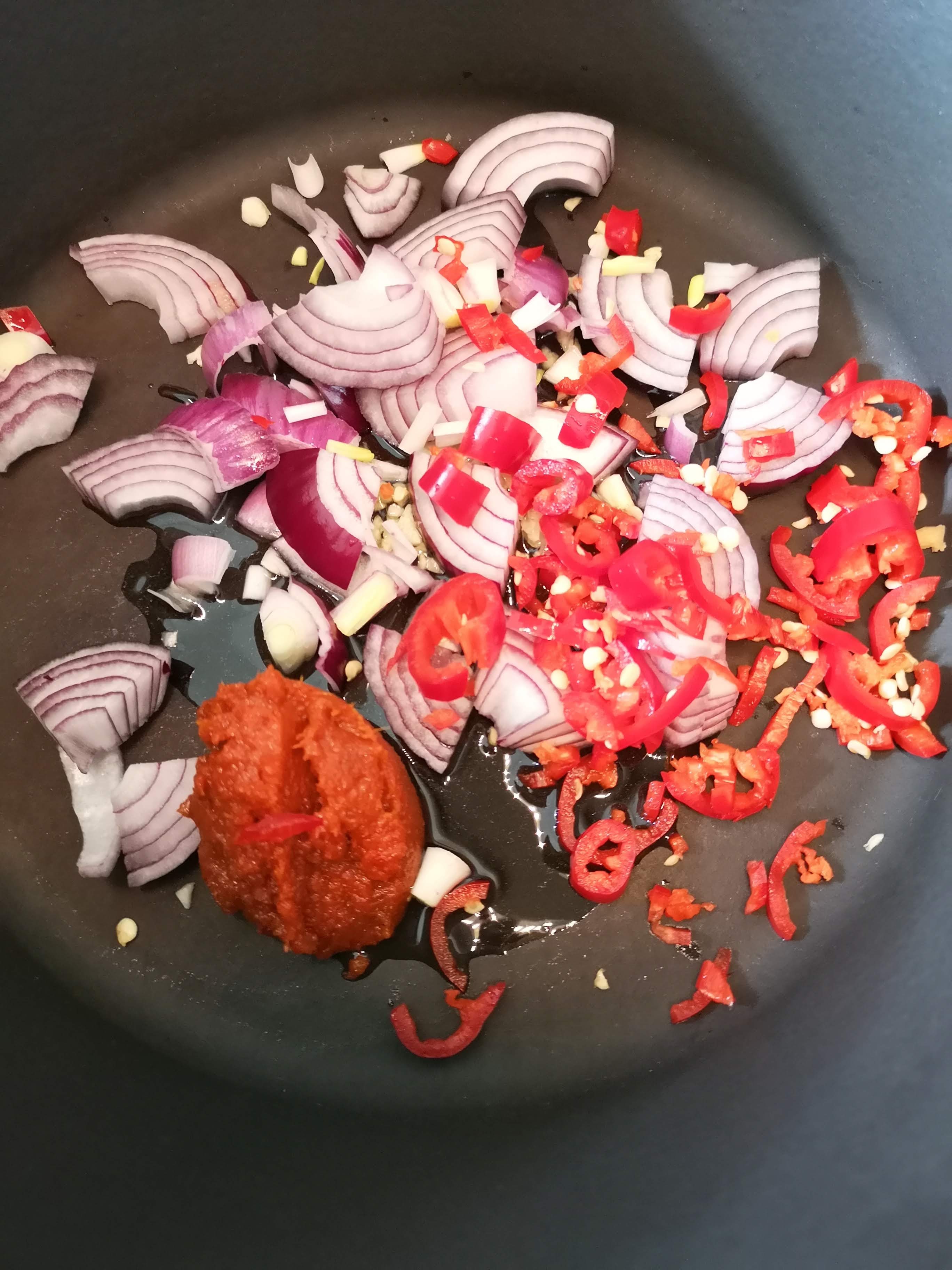- 3 el rode curry pasta (ik gebruikte die van Koh Thai)