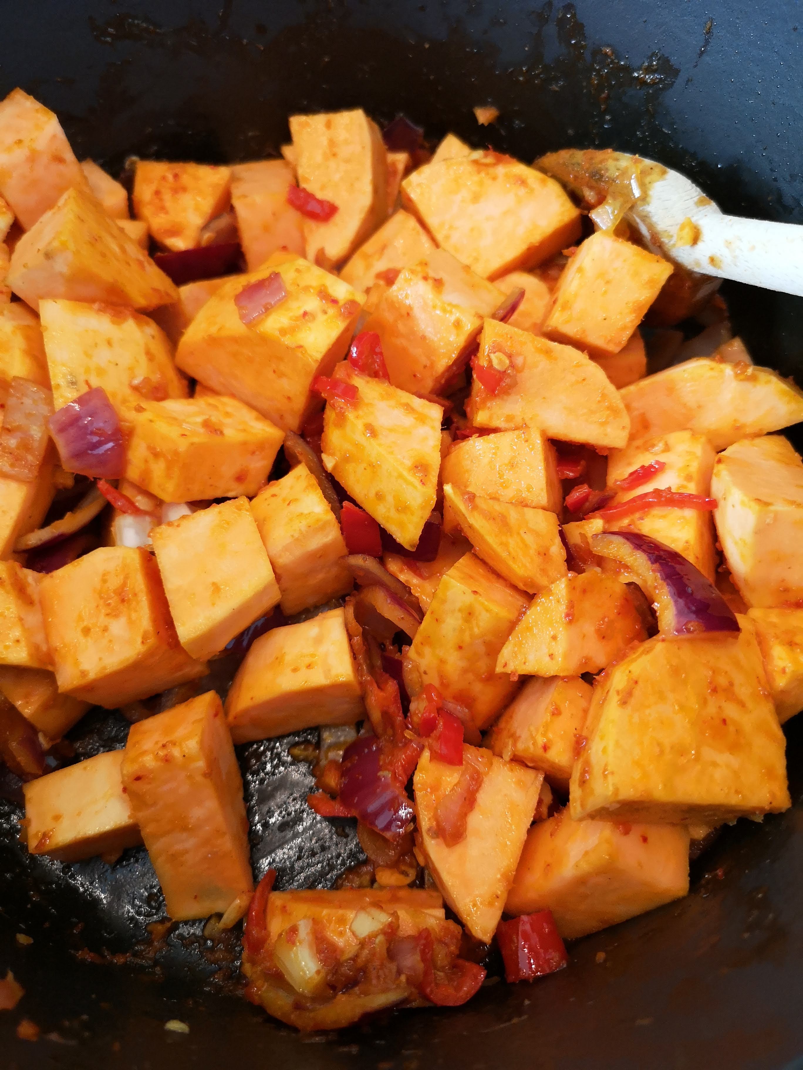Schil de zoete aardappel en snijd in blokjes. Was de wortelen en snijd in stukjes. Snijd de rode ui grof en pers de knoflooktenen. Snijd de rode peper in ringetjes.
