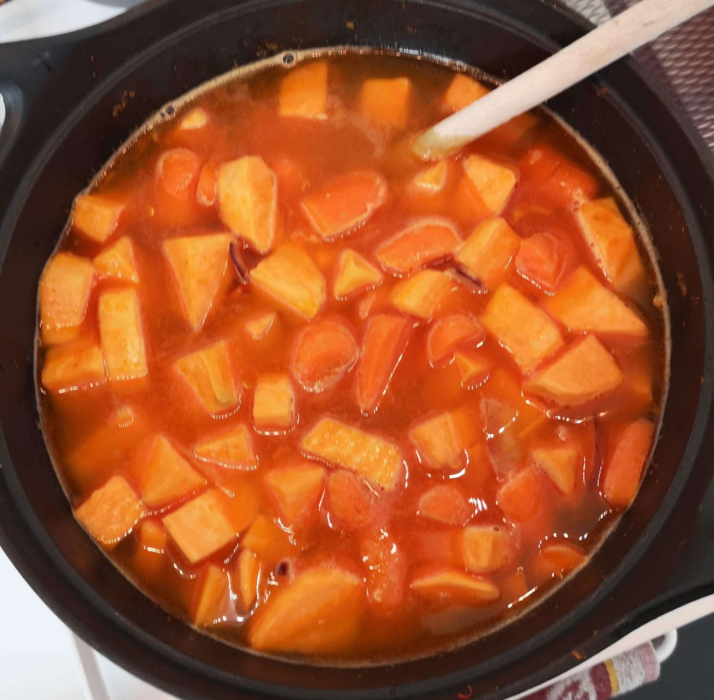 Doe een scheutje olijfolie in een soeppan. Doe hierin de knoflook, ui, rode peper en currypasta. Verhit kort totdat de ui wat glazig wordt. Voeg dan de zoete aardappel toe en bak dit op hoog vuur mee. Voeg na ongeveer 2 minuten ook de wortel toe en roer goed door.