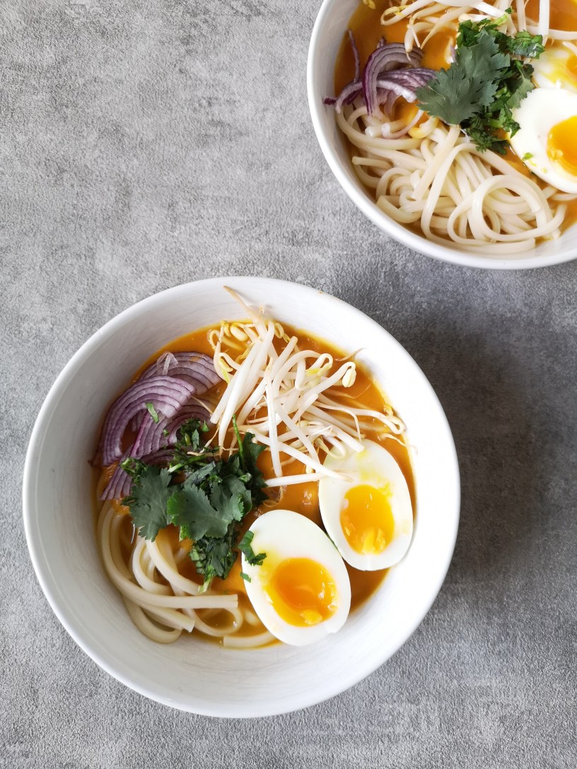 Deze soep is vrij stevig door de zoete aardappel als basis te nemen. Zoete aardappel, zeker in combinatie met wortel, leent zich er echter uitstekend voor om soep van te maken. Je krijgt er een mooie structuur van en een lekkere, licht-zoete smaak. Door de toevoeging van rode currypasta krijgt deze soep daarnaast ook nog iets pittigs en een echt Oosters accent. Een voedzame, vegetarische maaltijd. Als je het ei en de vissaus achterwege laat ook nog eens vegan.