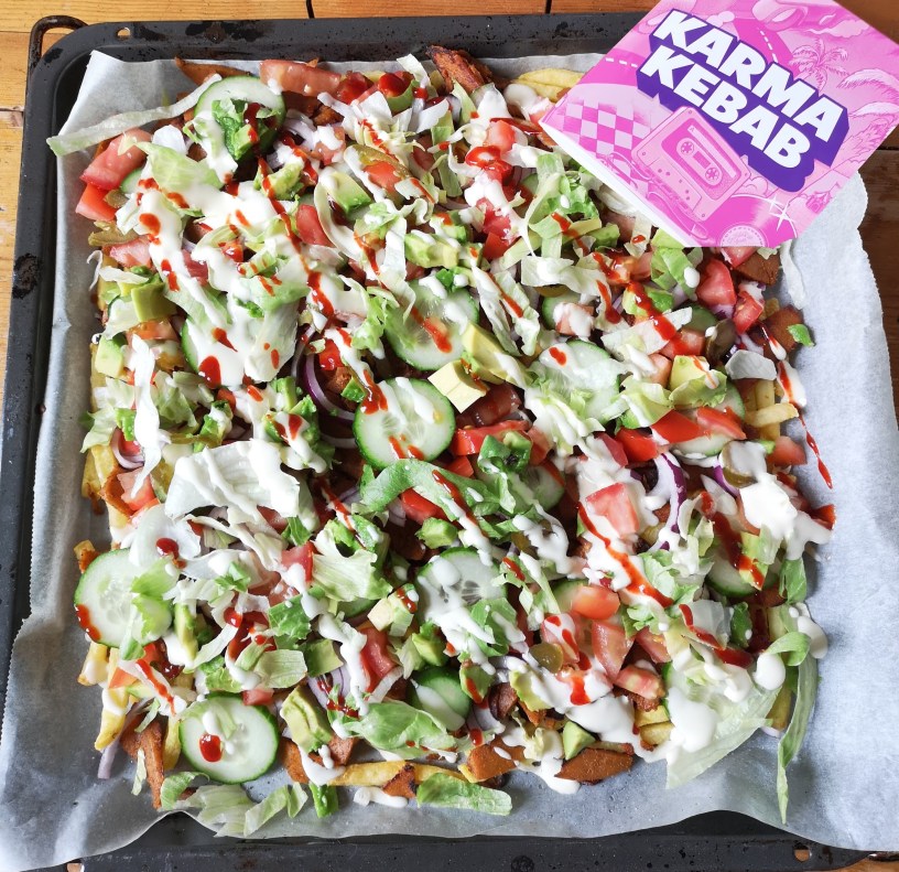 Als de friet klaar is, verdeel dan de Karma Kebab over de friet heen. Strooi hier een handje vegan cheddar overheen. Verdeel de ijsbergsla, ui, komkommer, avocado en tomaat over de kapsalon. Maak af met de vegan knoflooksaus en srirachasaus.