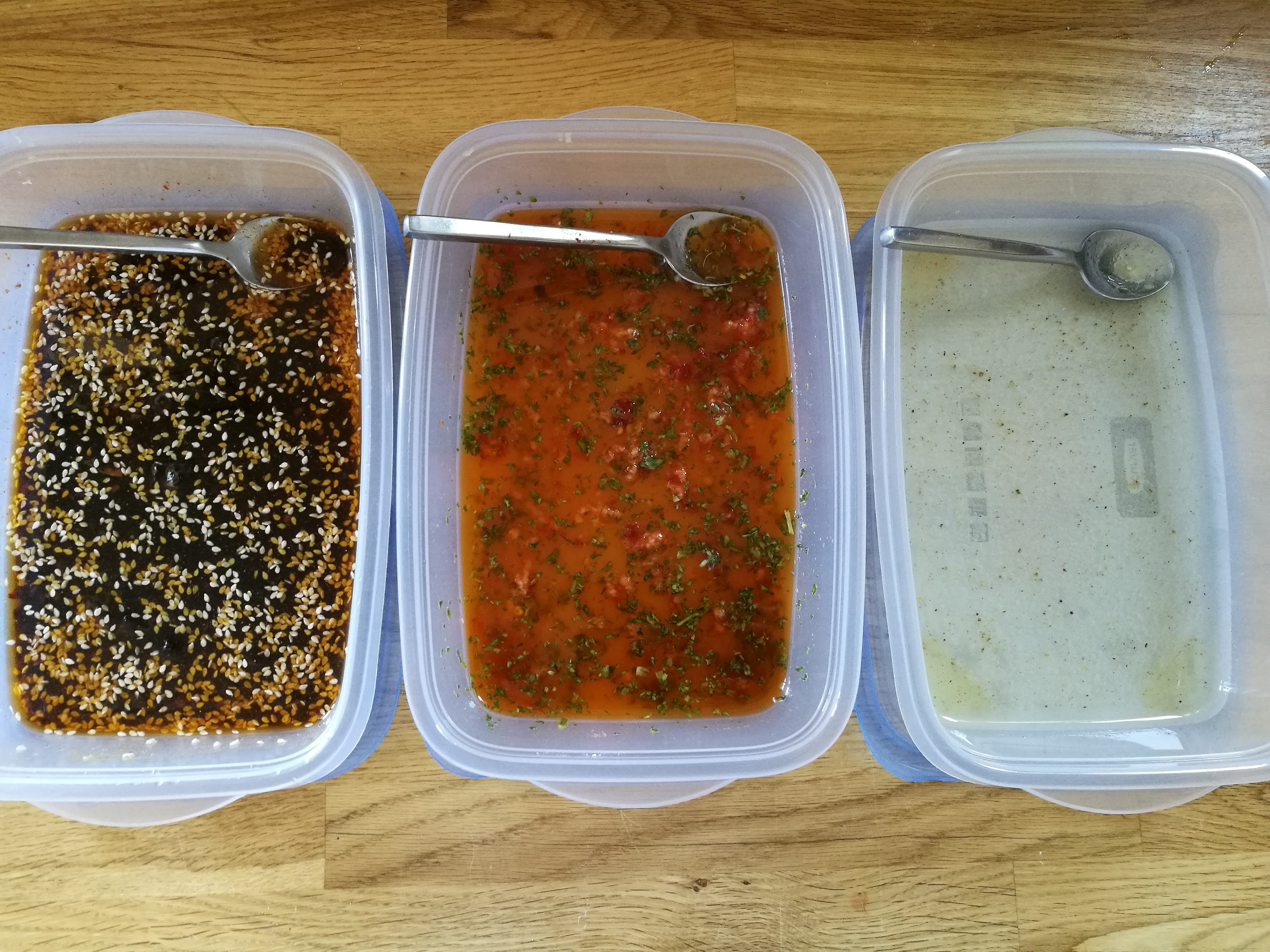 Ik heb drie verschillende marinades voor je, en iedere marinade kun je voor meerdere gerechten gebruiken. De donkere marinade is wat sterker van smaak, deze doet het erg goed bij bijvoorbeeld kip, varkensvlees of aubergine. De rode marinade is lekker pittig en is ook lekker bij kip, maar ook bij bijvoorbeeld garnalen. De rechtse marinade is lekker fris, erg lekker bij allerlei soorten vis. Deze marinade is vrij neutraal, dus hier kun je zelf nog lekker wat verse kruiden aan toevoegen.