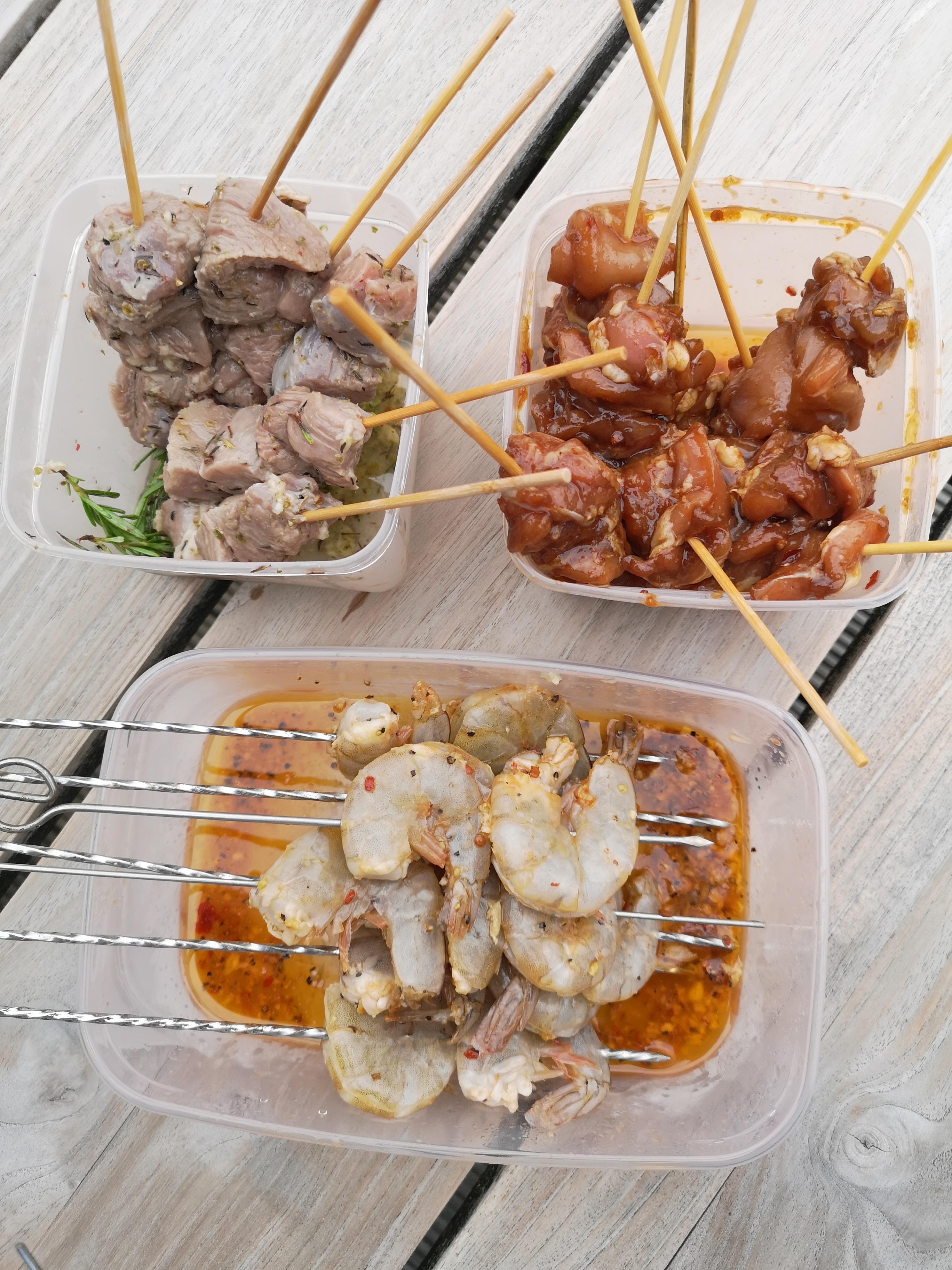 Pers de knoflook. Pers een halve citroen uit. Meng alle ingrediënten voor de marinade door elkaar. Snijd het vlees of vis van je keuze in kleine blokjes (garnalen kun je heel laten0 en schenk de marinade hier overheen. Dek af en laat het minimaal 2 uur in de koelkast intrekken, hoe langer hoe beter.