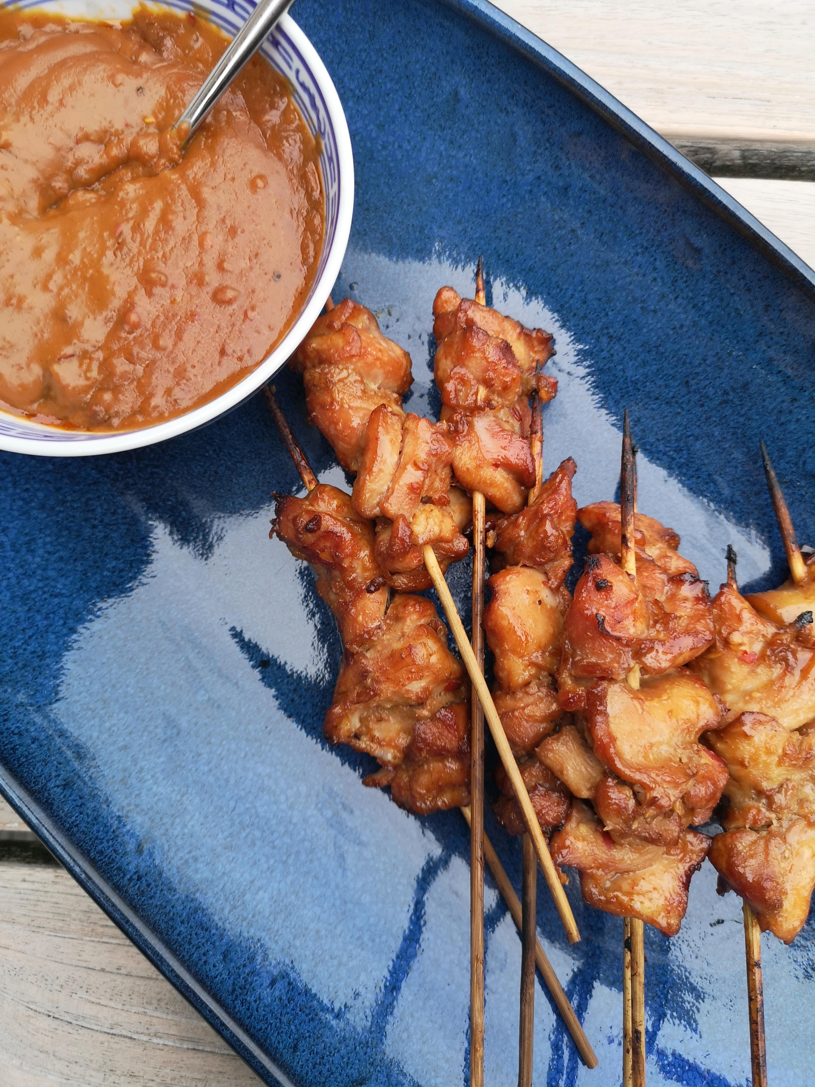 Zet een aantal satéprikkers in een glas met water. Haal het gemarineerde vlees/vis uit de koelkast en rijg dit aan de satéprikkers.