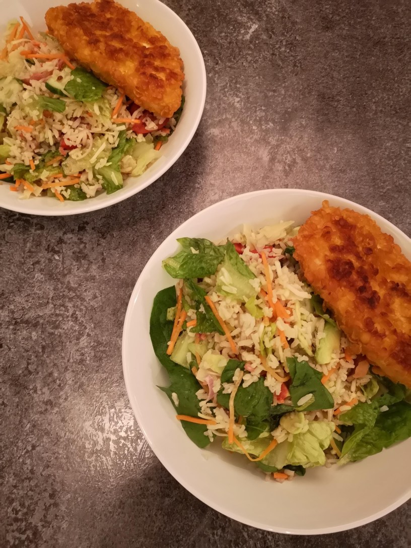 Schep de salade op de borden en leg er een kipschnitzel bij. Eet smakelijk!