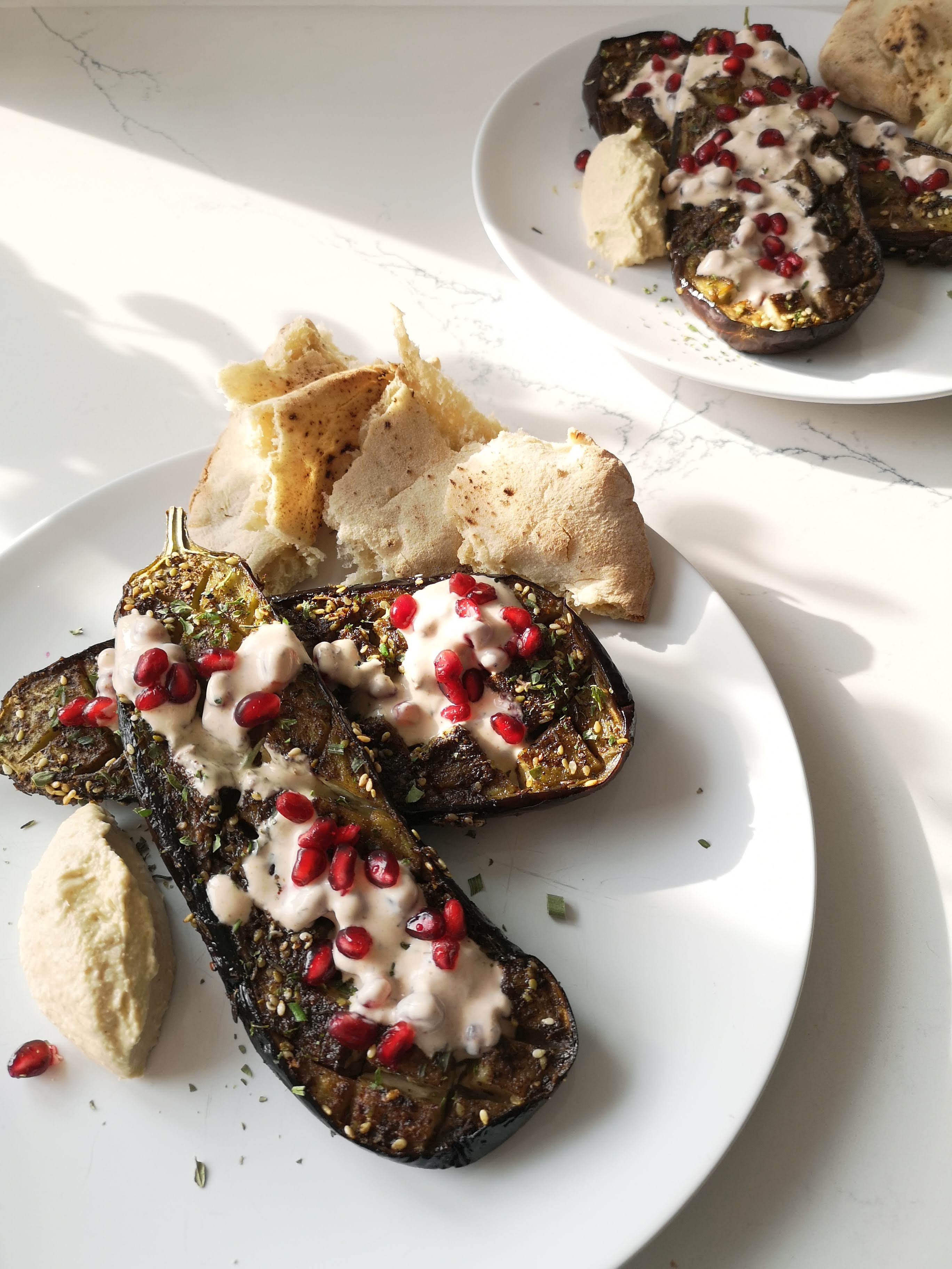 Serveer per persoon een hele aubergine. Leg de aubergines op een bord, verdeel hier de kerriesaus, de granaatappelpitjes en munt overheen. Serveer met hummus en de pitabroodjes.