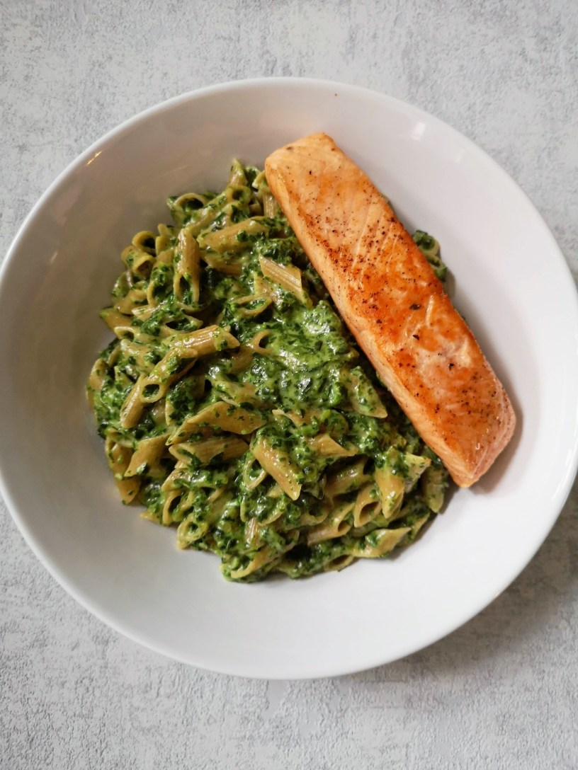 Schep de pasta door de spinaziesaus en verdeel over 2 borden. Serveer met de zalmfilet. Eet smakelijk!