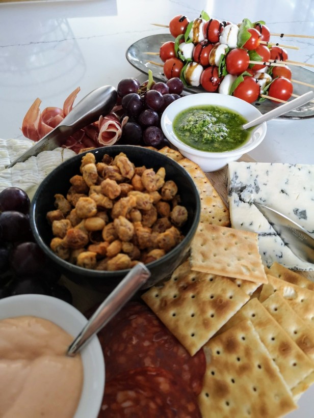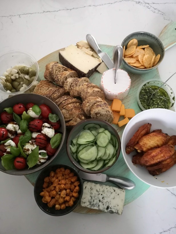 Het belangrijkste voor een goede borrelplank is denk ik voldoende afwisseling. Een goede basis is denk ik altijd wat brood of toastjes met tenminste 2 verschillende smeersels. Daarnaast kan een borrelplank voor mij niet zonder kaasjes. Nootjes of chips zijn altijd een goed idee voor wat crunch. Onmisbaar is wat mij betreft ook groente en/of fruit voor wat frissere smaken. Naast afwisseling in smaken en texturen maakt het je borrelplank ook aantrekkelijker als je zorgt voor kleur. Op de borrelplank hieronder vind ik bijvoorbeeld de tomaat en basilicum écht een eyecatcher.