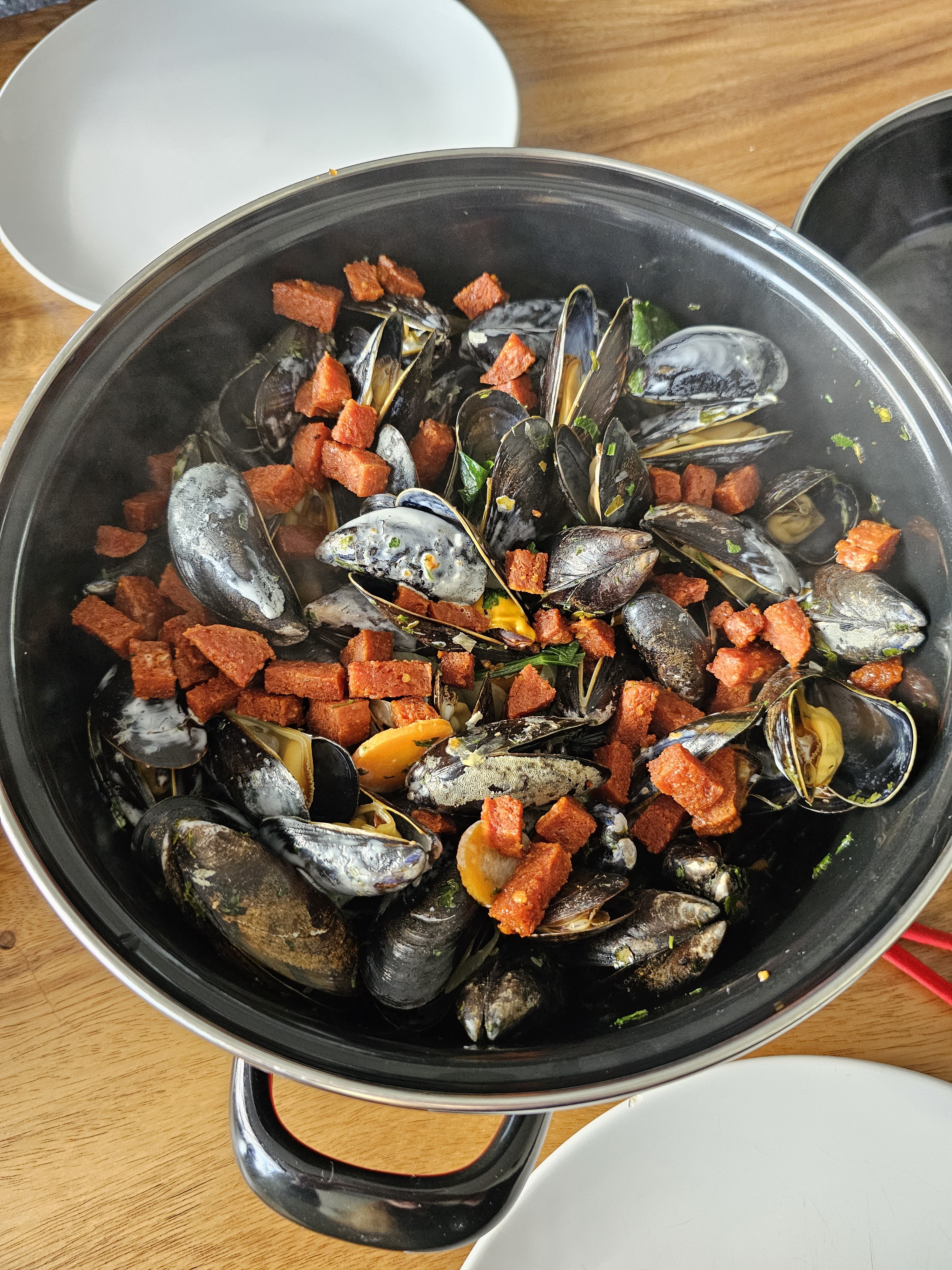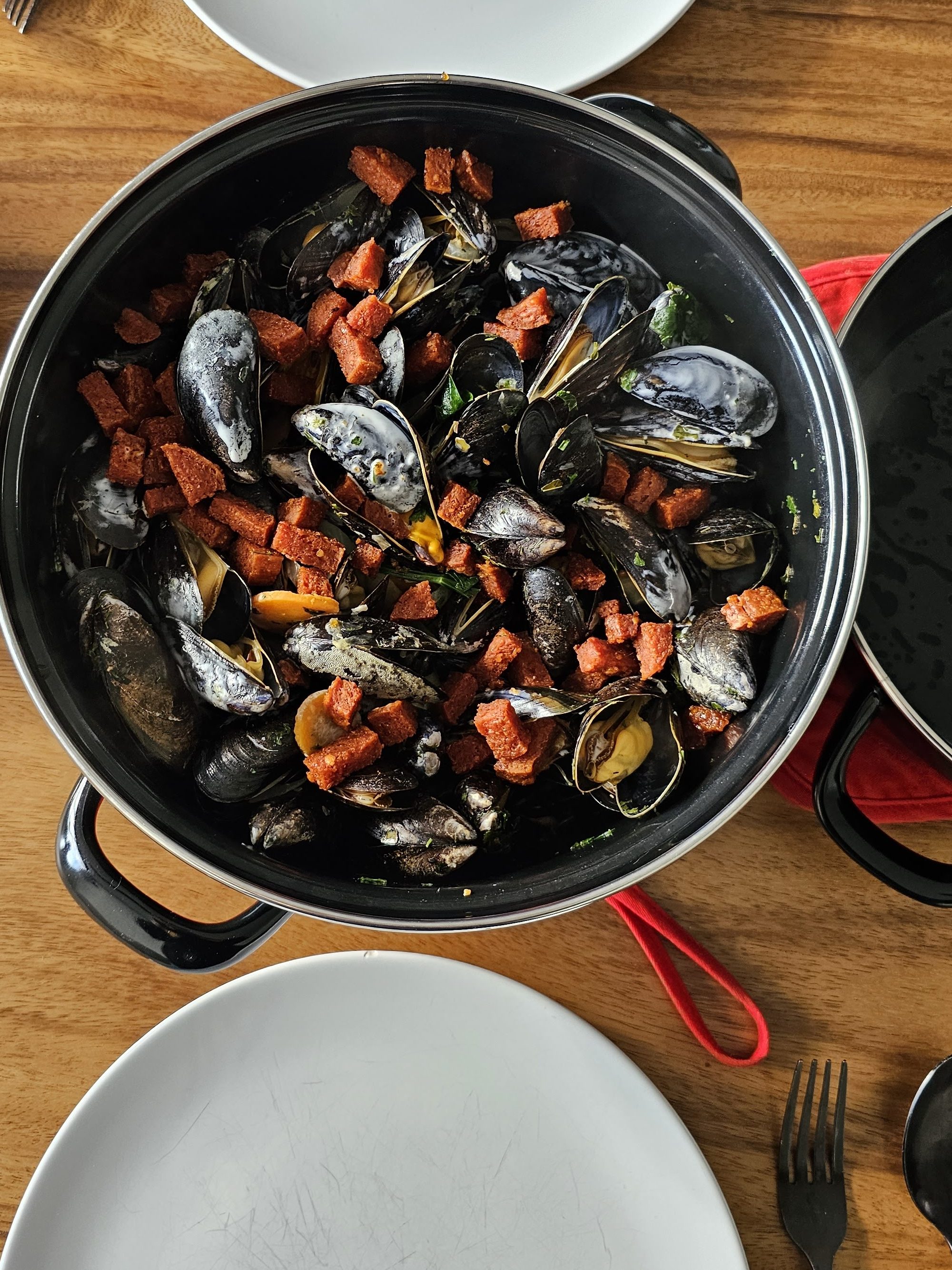 Snijd het stokbrood in plakjes. Verdeel de chorizo over de mosselen en schenk de room eroverheen. Eet smakelijk!