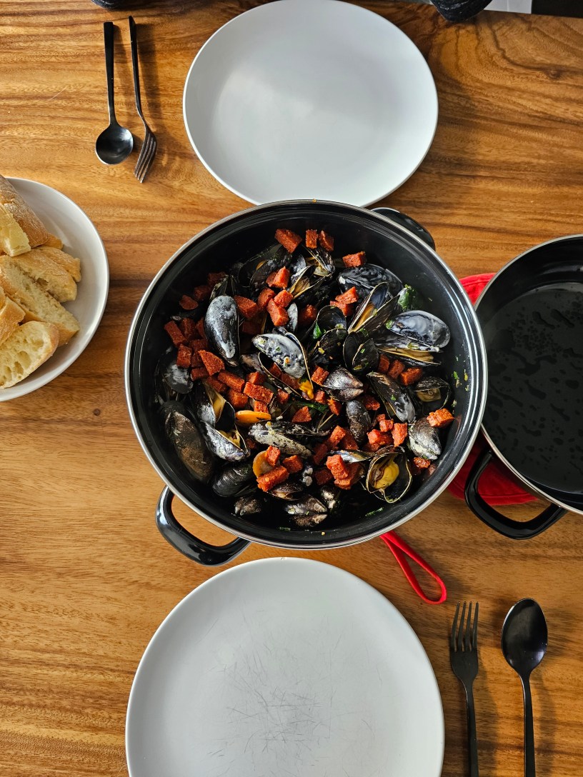 Snijd het stokbrood in plakjes. Verdeel de chorizo over de mosselen en schenk de room eroverheen. Eet smakelijk!